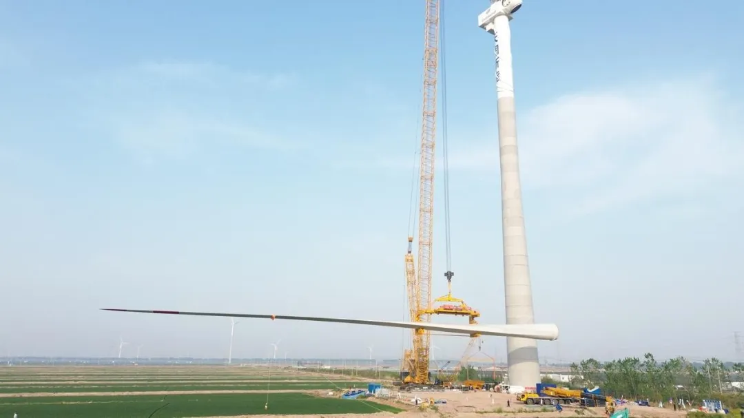 记者从中国铁建电气化局集团有限公司(以下简称“中国铁建电气化局”)获悉,4月20日中午,随着天润大丰风电项目最后一支叶片在155米高空完美“转体”与轮毂精准对接,我国自主研发生产的首台16.2兆瓦陆上单机容量最大发电机组顺利吊装完成。