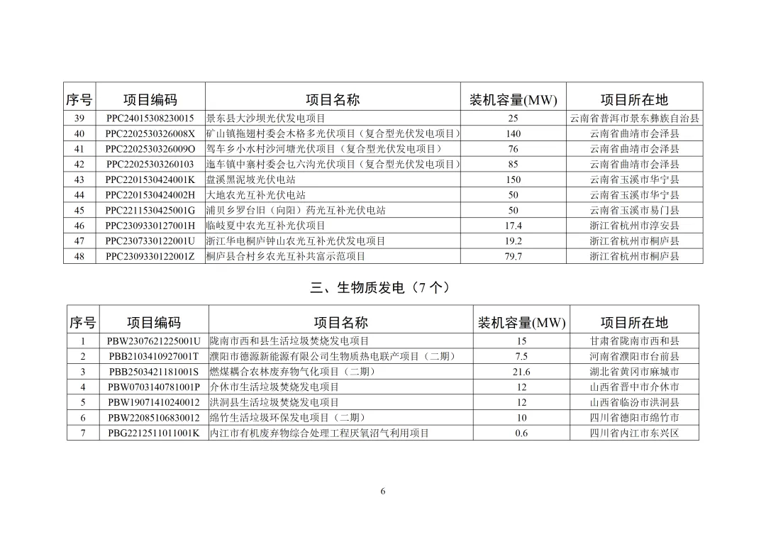 2025年12月,全国新增建档立卡新能源发电(不含户用光伏)项目共6233个,其中风电项目36个,光伏发电项目6190个(集中式光伏发电项目48个,工商业分布式光伏发电项目6142个),生物质发电项目7个。风电、集中式光伏发电、生物质发电项目清单见附件,工商业分布式光伏发电项目清单详见国家可再生能源发电项目信息管理平台网站(网址https://jdlk.renewable.org.cn/card-info-sheet/)。