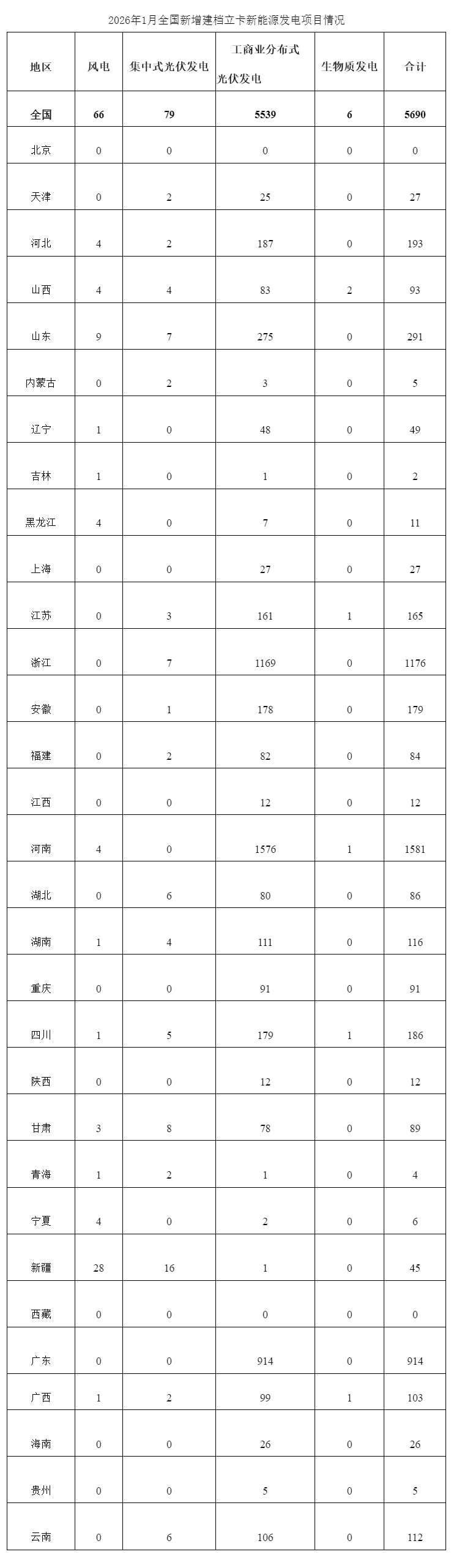 2026年1月,全国新增建档立卡新能源发电(不含户用光伏)项目共5690个,其中风电项目66个,光伏发电项目5618个(集中式光伏发电项目79个,工商业分布式光伏发电项目5539个),生物质发电项目6个。风电、集中式光伏发电、生物质发电项目清单见附件,工商业分布式光伏发电项目清单详见国家可再生能源发电项目信息管理平台网站(网址https://jdlk.renewable.org.cn/card-info-sheet/)。