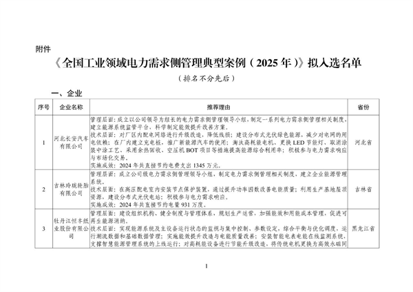 工信部:公示《全国工业领域电力需求侧管理典型案例(2025年)》拟入选名单