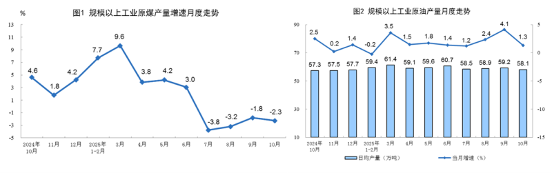 内容摘要:11月14日,国家统计局发布2025年10月份能源生产情况。10月份,规模以上工业原煤生产保持较高水平,原油、天然气生产稳步增长,电力生产增速明显提高。1—10月份,规上工业原煤产量39.7亿吨,同比增长1.5%;规上工业原油产量18064万吨,同比增长1.7%;规上工业原油加工量61424万吨,同比增长4.0%;规上工业天然气产量2170亿立方米,同比增长6.3%;规上工业发电量80625亿千瓦时,同比增长2.3%。