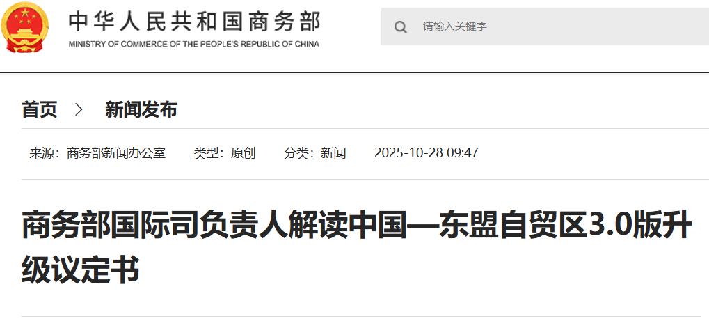 内容摘要:10月28日,商务部国际司负责人解读中国—东盟自贸区3.0版升级议定书。在绿色经济领域,双方以全球发展倡议目标原则为引领,建立了自贸区项下的全面合作框架。双方首次对绿色经济、新能源、清洁能源、可持续金融、绿色技能等作出明确定义,承诺不将环境标准作为贸易保护主义的变相手段,努力消除环境产品和服务相关贸易壁垒,致力于环境与贸易相互促进、共同发展。双方确立了绿色贸易、绿色投资、循环经济、可持续金融、绿色技术、绿色标准、可持续能源、数字化绿色化协同发展8大优先合作领域,贯穿研发、融资、生产、消费、回收全链条,将为打造区域经济绿色引擎、实现高质量发展提供重要支撑。