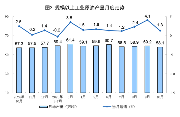 原油生产保持增长。10月份,规上工业原油产量1800万吨,同比增长1.3%,增速比9月份放缓2.8个百分点;日均产量58.1万吨。