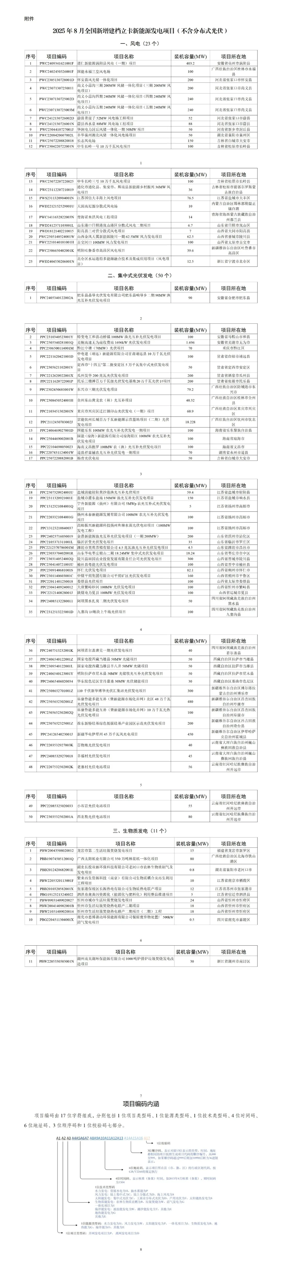 2025年8月,全国新增建档立卡新能源发电(不含户用光伏)项目共8658个,其中风电项目23个,光伏发电项目8624个(集中式光伏发电项目50个,工商业分布式光伏发电项目8574个),生物质发电项目11个。风电、集中式光伏发电、生物质发电项目清单见附件,工商业分布式光伏发电项目清单详见可再生能源发电项目信息管理平台网站(网址https://jdlk.renewable.org.cn/card-info-sheet/)。