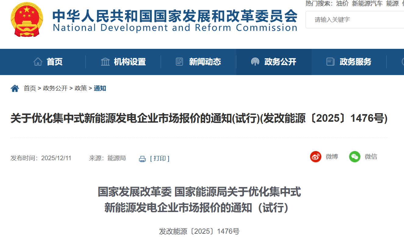 - 12-112025 《关于优化集中式新能源发电企业市场报价的通知(试行)》发布
