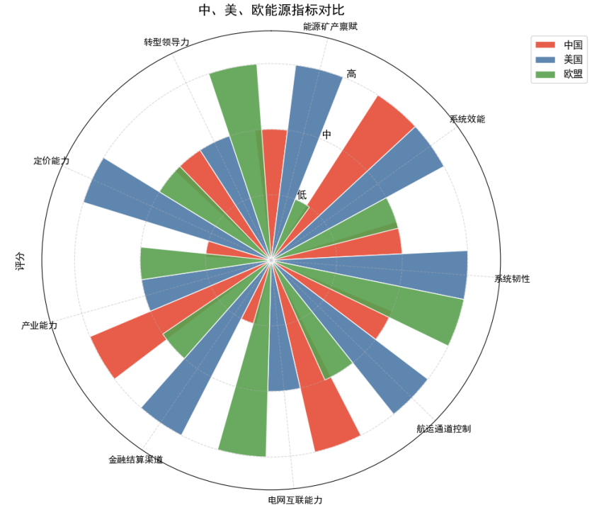三大经济体在资源、技术与治理三个维度上呈现出显著的结构性差异,塑造了各具特色的能源转型战略逻辑:
