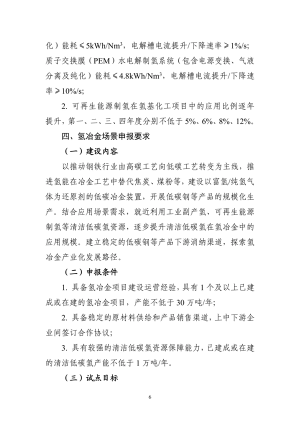 (四)氢冶金。以推动钢铁行业由高碳工艺向低碳工艺转变为主线,就近利用工业副产氢、可再生能源制氢等清洁低碳氢源,建设以富氢/纯氢气体为还原剂的低碳冶金装置。建立稳定低碳钢等产品下游消纳渠道。