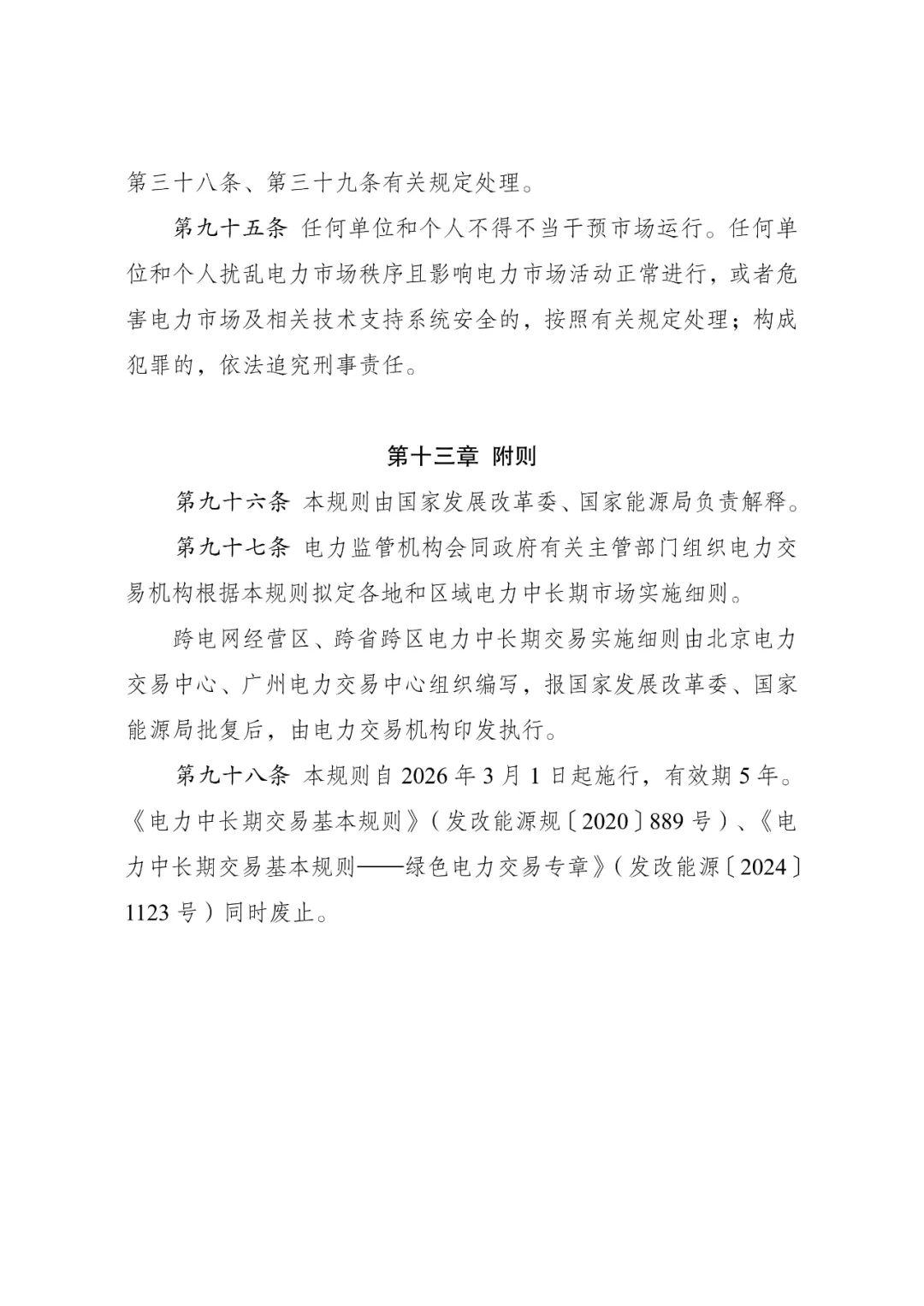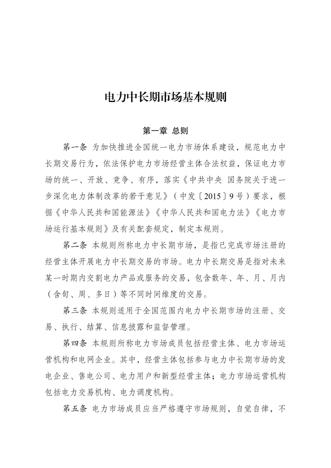 为贯彻落实加快建设全国统一电力市场要求,深化电力中长期市场建设,规范电力中长期交易行为,适应电力改革发展需要,根据《电力市场运行基本规则》(中华人民共和国国家发展和改革委员会令2024年第20号)、《国家发展改革委 国家能源局关于加快建设全国统一电力市场体系的指导意见》(发改体改〔2022〕118号)等有关规定,我们组织修订了《电力中长期交易基本规则》,现将修订形成的《电力中长期市场基本规则》印发给你们,请遵照执行。